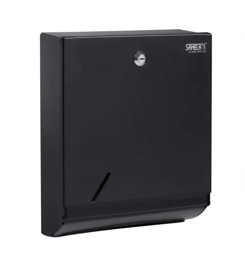 Nerezový zásobník skládaných papírových ručníků uzamykatelný maximální rozměr náplně 260 x 100 mm kapacita zásobníku cca 600/800 papírových utěrek rozměry 340 x 110 x 265 mm montáž na stěnu povrch černý - Komaxit