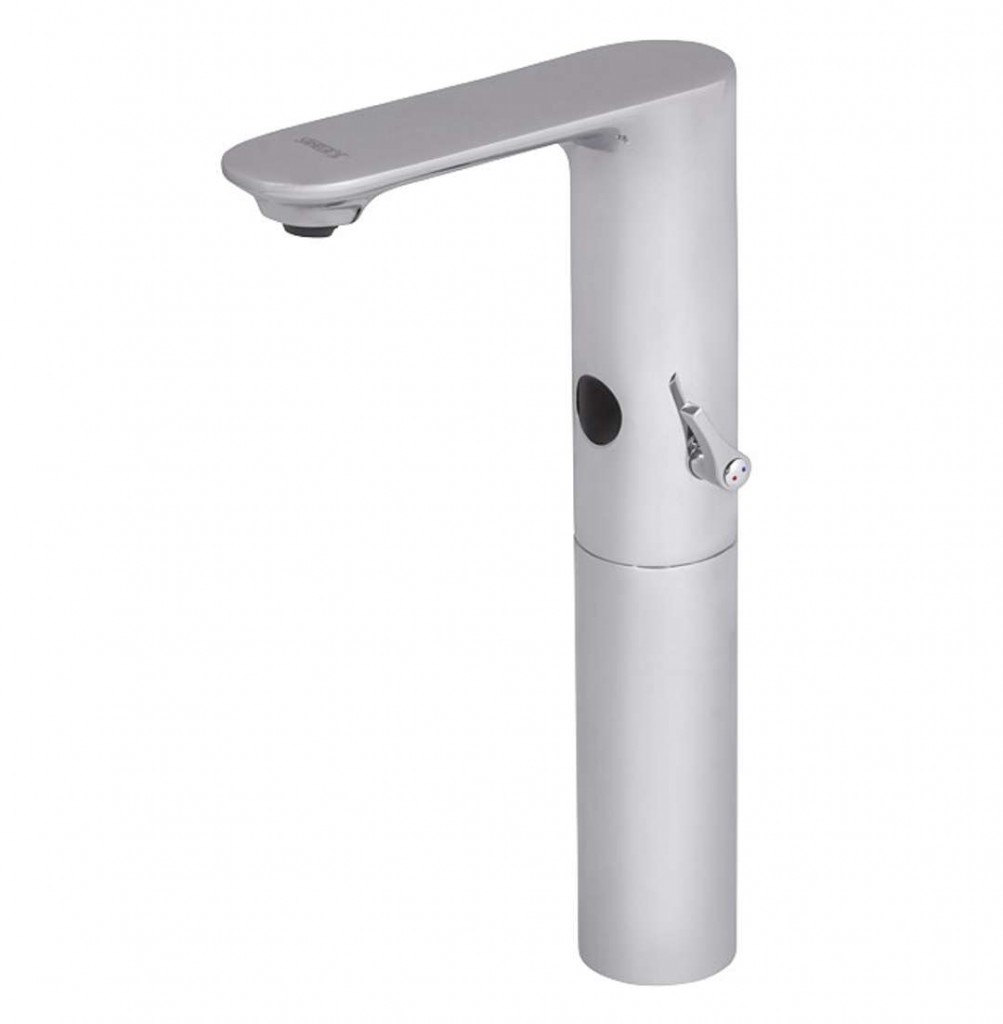 Automatická umyvadlová směšovací baterie úsporný perlátor, průtok 6 l/min hygienický proplach možnost jednorázového nastavení regulace teploty vody a následné zaslepení víčkem elektromagnetický ventil je integrován v těle baterie pro přívod teplé a studené vody, nastavení teploty páčkou reaguje na přítomnost rukou ve snímané zóně okamžitým spuštěním vody k vypnutí vody dojde po vyjmutí rukou po uplynutí nastavené doby, v rozsahu 0,25-7,75 s bezpečnostní funkce vypnutí vody po 5 minutách možnost přepnutí do režimu START/STOP bateriové napájení, hlídaní stavu baterie povrchová úprava: chrom vhodné pro umyvadla na desku comfort zone pro maximální výšku umyvadla 150 mm nastavení parametrů pomocí dálkového ovladače SLD 03 Technické údaje napájecí napětí 6 V příkon 2 W životnost baterií: 4 ks AA alkalických baterií cca 2 roky, 1,5 V, 2700 mAh (při 100 sepnutích denně) dosah, standardně: 0,13-0,19 m dosah v režimu START/STOP: 0,05-0,15 m doporučený pracovní tlak 0,1-0,6 MPa vstup vody: vnější závit G 1/2 výška: 311 mm délka výtoku: 126 mm Obsah dodávky výtokové ramínko s regulací teploty, elektronikou a elektromagnetickým ventilem propojovací hadice, rohový ventil s filtrem a zpětnou klapkou (2 ks) záslepka regulace teploty 4 ks AA alkalických baterií 1,5 V, 2700 mAh, s pouzdrem dálkové ovládání SLD 03 není součástí balení