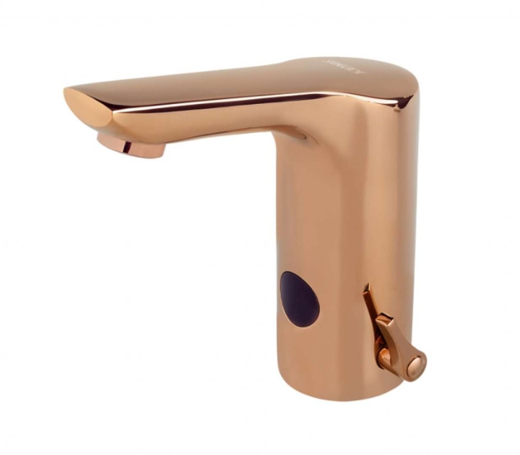 Stojánková plně elektronická umyvadlová baterie barva rose gold výška baterie 152 mm délka výtoku 97 mm komfortní zóna 128 mm elektromagnetický ventil je integrován v těle baterie nastavení teploty páčkou možnost jednorázového nastavení teploty a následné zaslepení víčkem bezdotykové ovládání povrchová úprava PVD s úsporným naklápěcím perlátorem síťové napájení hygienický proplach vnější závit G 1/2" bez odtokové soupravy možnost přepnutí do režimu Start/Stop možnost ovládání přes Bluetooth aplikaci nebo dálkový ovladač bezpečnostní funkce vypnutí vody po 5 minutách Technické údaje doporučený tlak 1 - 6 bar nastavitelné vypnutí vody po uplynutí 0,25 - 7,75 s napájecí napětí 24 V DC příkon 2 W dosah standardně 0,13 - 0,19 m dosah v režimu Start/Stop 0,05 - 0,15 m průtok 6 l/min Obsah balení umyvadlová baterie s Bluetooth modulem 1x elektromagnetický ventil sestava Y-dílu a hadic s integrovanou zpětnou klapkou propojovací hadice 2x rohový ventil s filtrem a zpětnou klapkou záslepka regulace teploty