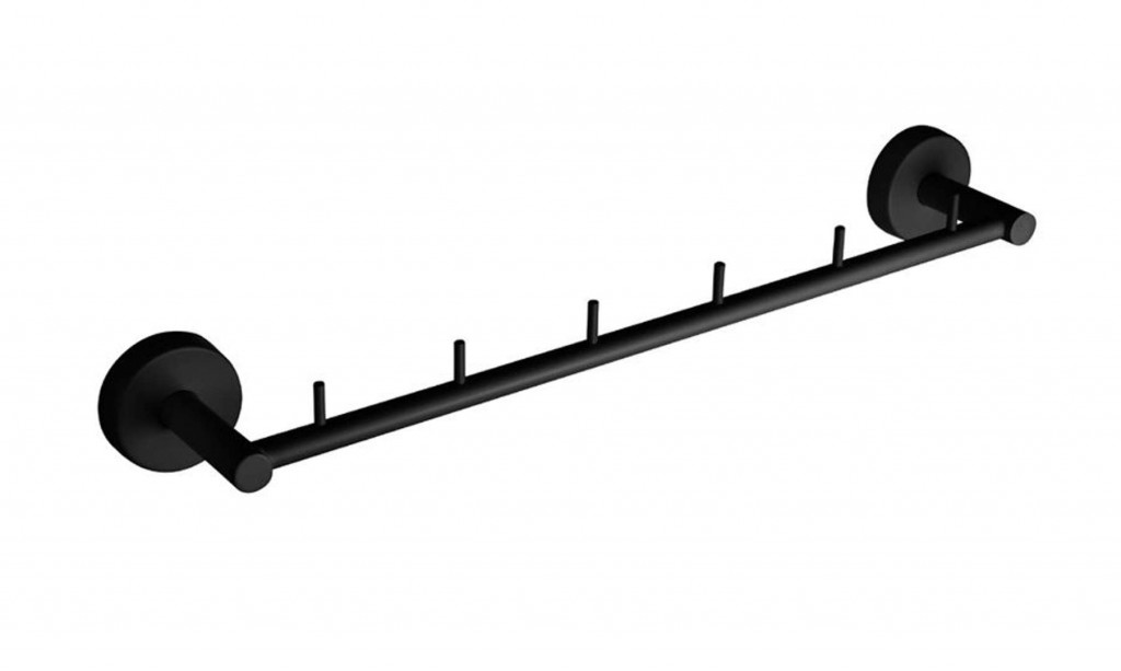 Šestiháček barva matná černá materiál nerez rozměry 480 x 58 x 55 mm kulaté krycí rozety 6 háčků nástěnná montáž instalace lepením