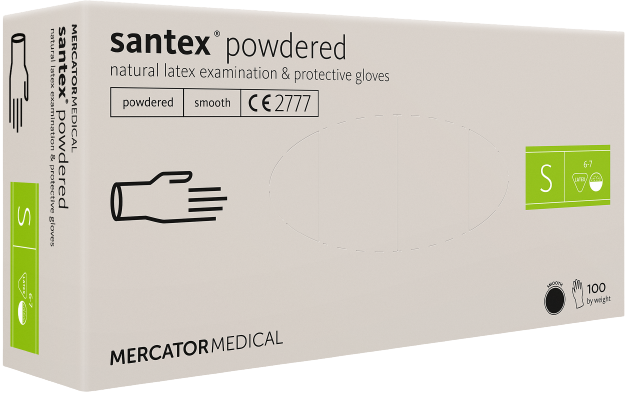 Santex® powdered jsou ekonomické pudrované latexové rukavice. Hladký vnější povrch zajišťuje pevný úchop při provádění prací. santex® powdered jsou pudrované rukavice, které minimalizují potivost rukou. Rukavice reprezentují skvělou kvalitu za nízkou cenu.