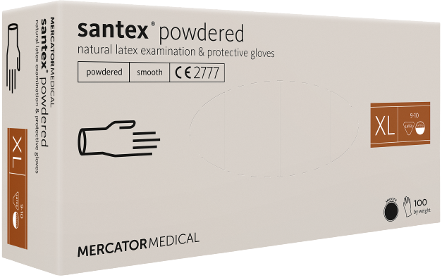 Santex® powdered jsou ekonomické pudrované latexové rukavice. Hladký vnější povrch zajišťuje pevný úchop při provádění prací. santex® powdered jsou pudrované rukavice, které minimalizují potivost rukou. Rukavice reprezentují skvělou kvalitu za nízkou cenu.
