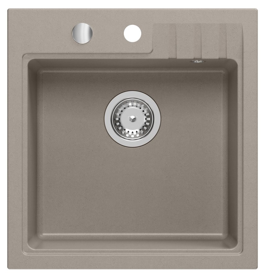 Granit Speciální složení materiálu použitého pro výrobu (kamenná drť, např. křemičitého písku - žuly a polymerové pryskyřice) a jeho vysoká hustota garantuje bezpečné používání výrobku, a proto jsou granitové dřezy tak oblíbené. Na granitovém dřezu nejsou vidět zaschlé kapky, je odolný vůči skvrnám a neztrácí barvu. Povrch je odolný proti poškrábání a odolává teplotám až do 180 °C. Při jejich údržbě se používají obvyklé čistící prostředky nebo prostředky na nádobí s jemným abrasivem. Výhodou je rozmanitá barevná nabídka. Instalace: Horní montáž Dřez je usazen na pracovní desku a hranou ji převyšuje. Včetně sítkové výpusti se sifonem, odpad DN40.