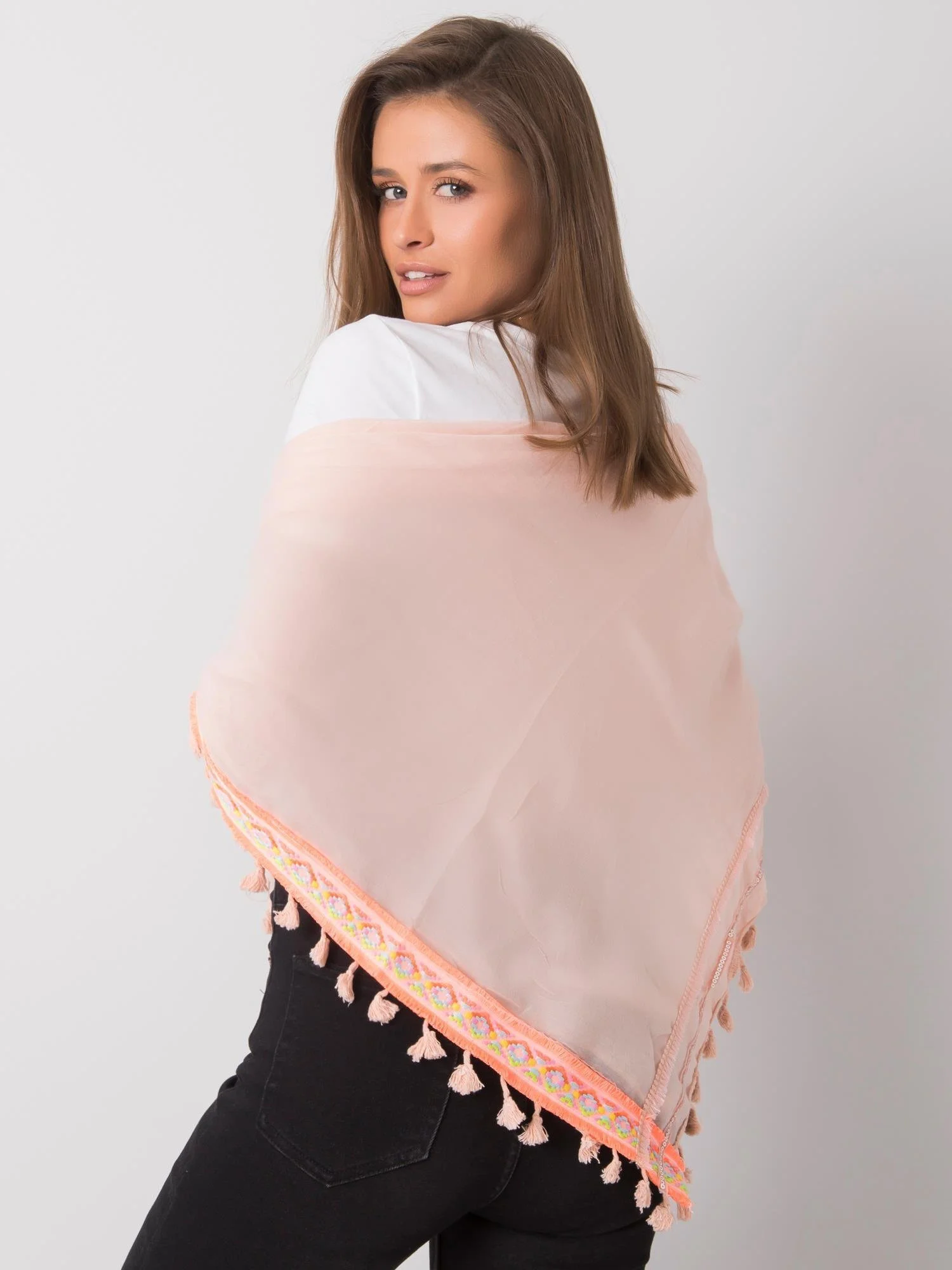 Světle růžový šátek s ozdobným lemováním. složení látky: 30 % viskóza, 70 % polyester způsob praní: praní v pračce na 30 °C rozměry: přibližně 140 x 140 cm