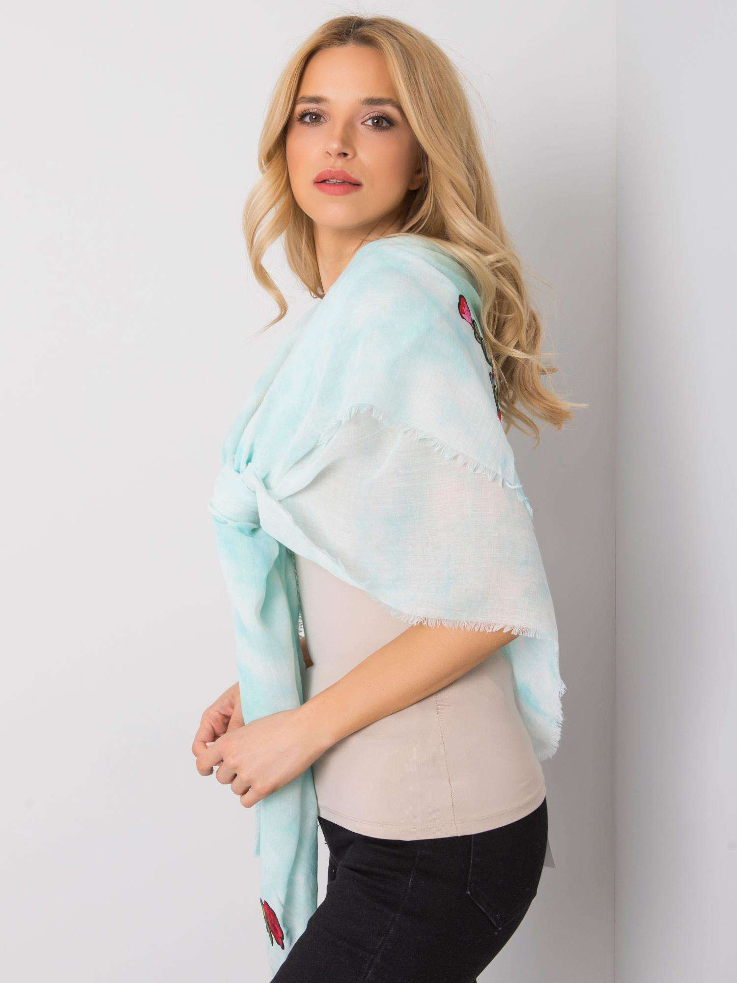 Dámská šála mentolové barvy s barevnými nášivkami. složení látky: 80 % viskóza, 20 % bavlna způsob mytí: ruční mytí Rozměry: přibližně. 140 x 140 cm
