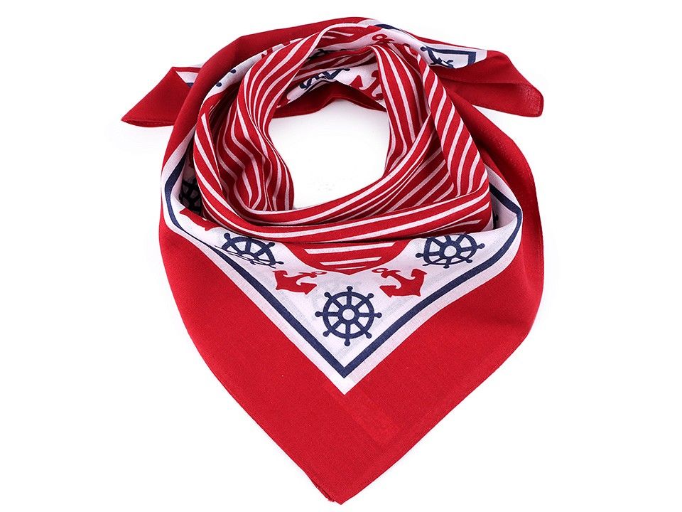 Bavlněný šátek s potiskem kotev a kormidel ocení všichni milovníci námořnického stylu. Skvěle doplní váš outfit. Je velice příjemný, vyrobený ze 100% bavlny. Šátek je české výroby, která vám zajišťuje vysokou kvalitu. Potisk šátku je jednostranný. Šířka: 55 cm Délka: 55 cm