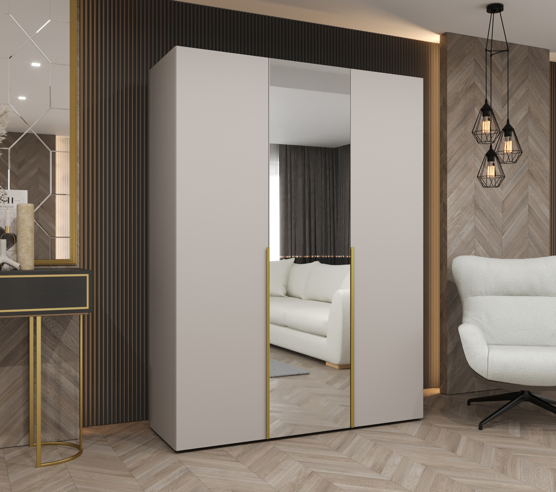 Domů Nábytek Ložnice Skříně a komody Šatní skříně Šatní skříň Abi Alicante 2 Rozměry: 150 cm, Pásky / úchyty: Zlatý, Barva korpusu + barva dveří: Kašmír + Kašmír