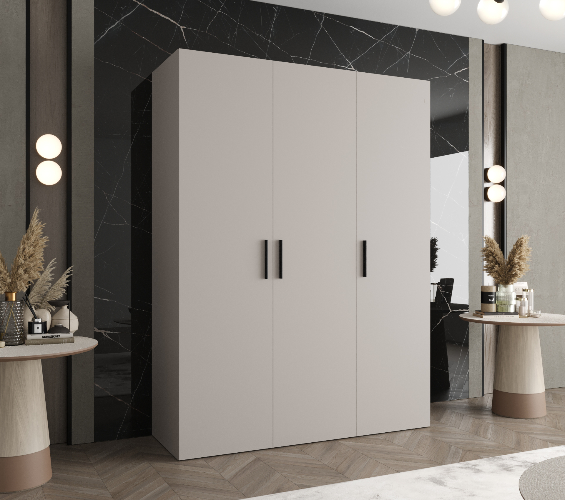 Domů Nábytek Ložnice Skříně a komody Šatní skříně Šatní skříň Abi Bari 1 Rozměry: 150 cm, Pásky / úchyty: Černá, Barva korpusu + barva dveří: Kašmír + Kašmír