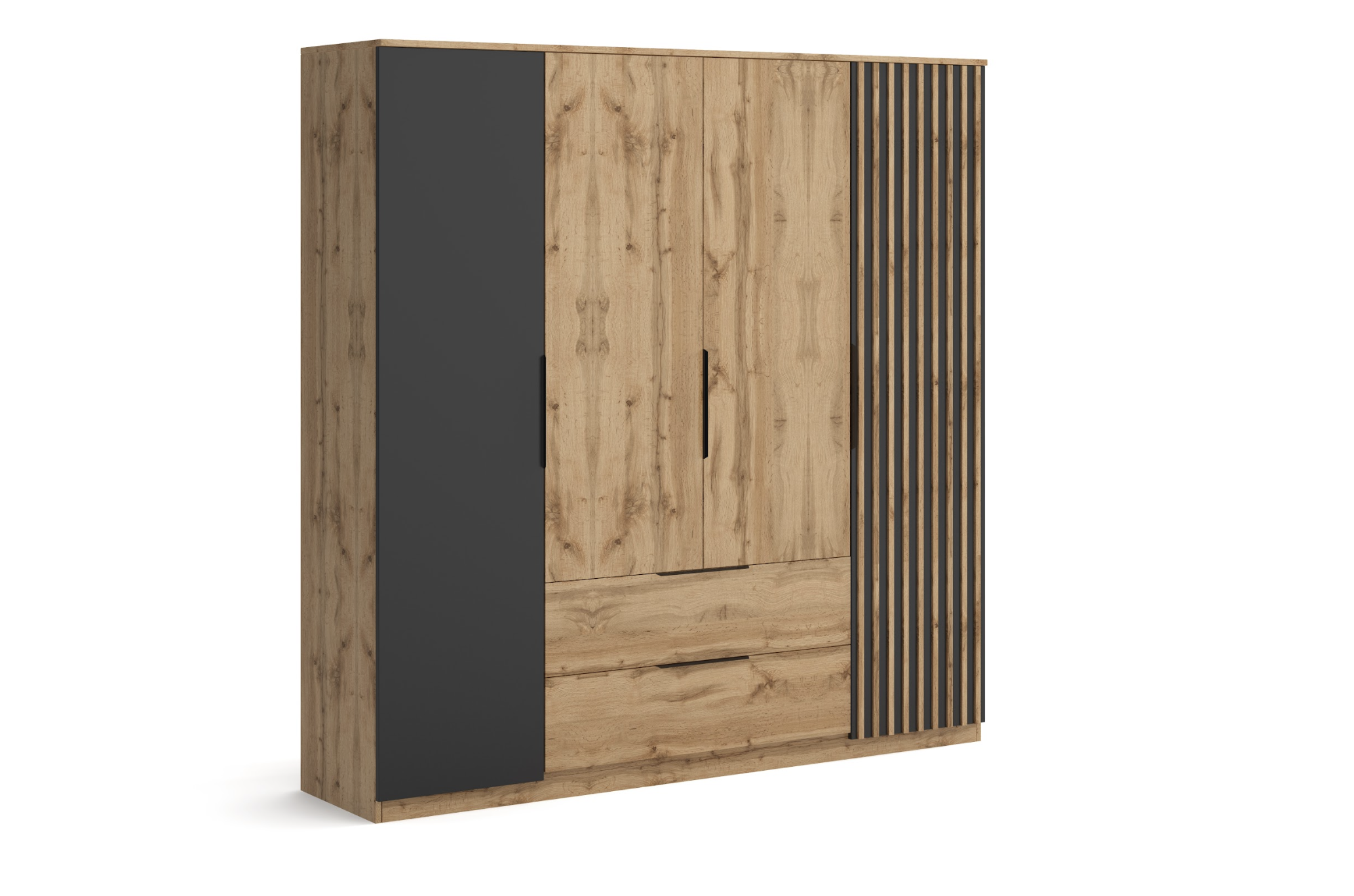 Šatní skříň Kris KR1 • Vlastnosti: Materiál Produkt je vyroben z laminované dřevotřískové desky o síle 16 mm. Hrany desek Hrany jednotlivých desek jsou opatřena PVC dýhou. BEZ zrcadla Šatní skříň je bez zrcadla. Vnitřní uspořádání Na pravé a levé straně jsou police. V prostřední části je šatní tyč a dvě zásuvky. • Barevné provedení Produkty ze sestavy Kris jsou dostupné v kombinaci Dub wotan a černá. Dub wotan Černá • Rozměry 200 cm celková výška 196 cm celková šířka 58 cm celková hloubka 16 mm tloušťka desky • Obývací sestava Kris Zobrazit více... Ložnicová sestava Kris Zobrazit více... • UpozorněníOdstíny prezentované na fotografiích jsou ilustračním materiálem, barvy se mohou lišit od vyobrazení na fotografiích podle nastavení vašeho zobrazovacího zařízení.