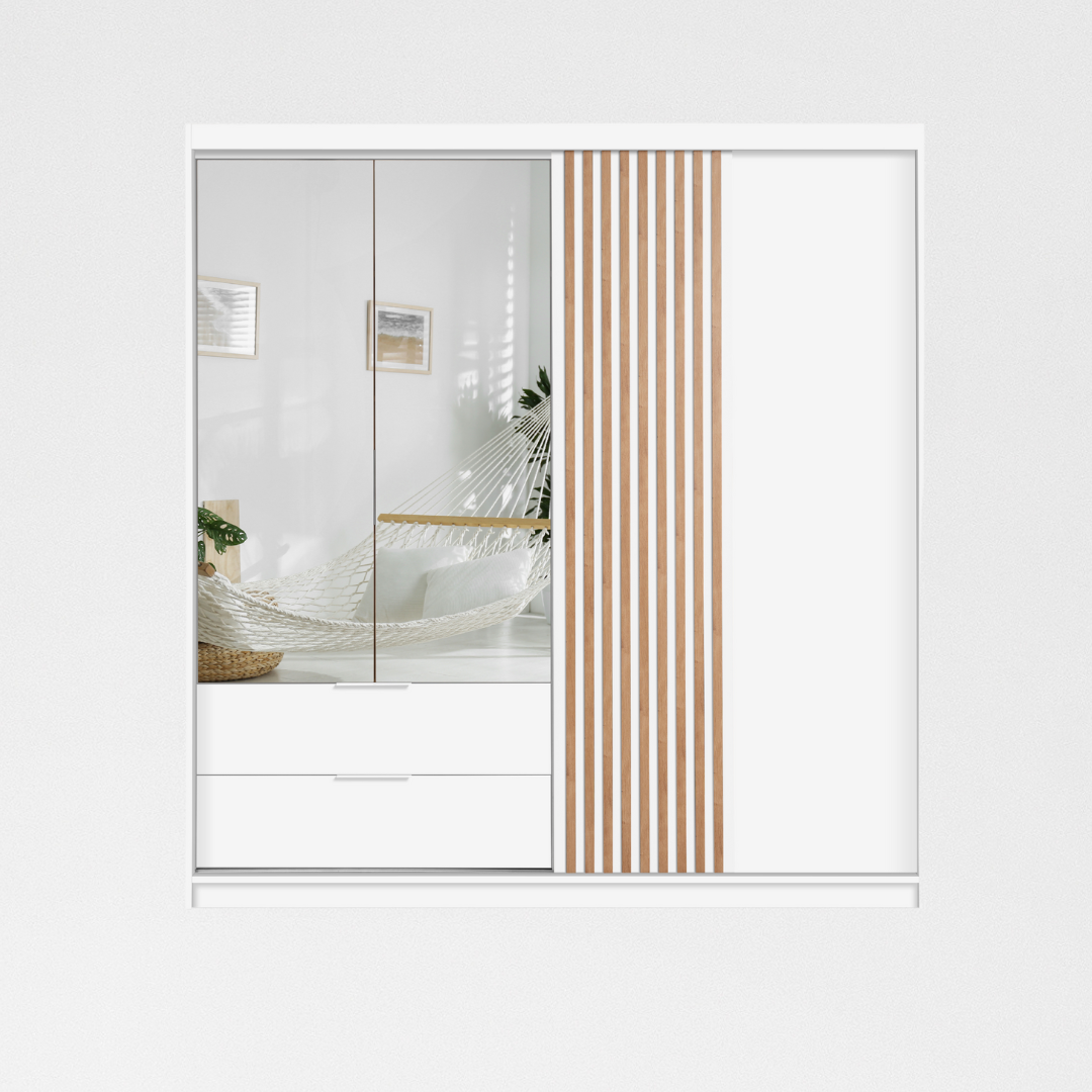 Šatní skříň Majorka Designová šatní skříň Majorka se zrcadlem je dostupná ve třech rozměrech šířky, každý si tak vybere tu svou. • Vlastnosti Materiál Produkty jsou vyrobeny z laminované LTD desky o síle 16 mm.  Hrany desek Hrany desek jsou opatřeny ABS dýhou. Zadní stěna Na zadní stěnu jsou použity sololitové desky. Zrcadlo Šatní skříň Majorka je dodávána se zrcadlem. Dveře U rozměru 203 cm a 250 cm je kombinace klasických a posuvných dveří. • Barevné provedení Šatní skříň Majorka je dostupná v bílé barvě nebo v odstínu dub artisan. U rozměru 203 cm a 250 cm je skříň doplněna o lamely v odstínu dob artisan. Bílá matná Dub artisan 105 cm 203 cm 250 cm • Vnitřní uspořádáníU šířky 103 cm vám bude k dispozici jedna šatní tyč, nad níž se nachází police a ve spodní části dvě zásuvky.Šířka 203 cm vám nabídne po levé straně tři police a pod nimi dvě zásuvky. Na pravé straně jsou dvě šatní tyče nad sebou.Prostorná skříň o šířce 250 cm na levé a pravé straně má dohromady celkem dvě šatní tyče, nad nimiž jsou dvě police. V prostřední části jsou tři police a pod nimi dvě zásuvky. šířka 203 cm šířka 203 cm šířka 250 cm šířka 250 cm • Rozměry 213 cm celková výška 105 / 203 / 250 cm  celková šířka 60 cm celková hloubka 16 mm tloušťka desky •