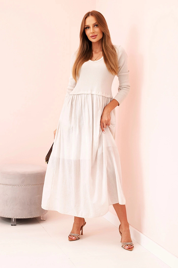 Lehká dámská šaty ušité z příjemné na dotek bavlněné pleteniny, která se krásně přizpůsobí postavě. Horní část z žebrovaného materiálu zvýrazňuje ženskou linii, zatímco spodní část s mírně nařaseným zakončením dodává lehkost. Hluboký V výstřih opticky prodlužuje krk a dlouhý rukáv zajišťuje pohodlí v chladnějších dnech. Ideální na každodenní nošení, do práce, na procházku nebo setkání – šaty skvěle vypadají jak s teniskami, tak s kotníkovými botami. Přírodní složení zajišťuje, že jsou šetrné k pokožce a pohodlné k nošení po celý den. Velikost bude vhodná pro dámy nosící XS, S nebo M – obvod hrudníku do cca 100 cm. Výroba Italská Vlastnosti produktu: Pohodlný, dlouhý maxi střih Horní část z žebrované pleteniny, spodní část z lehké bavlny Výstřih do V, který zvýrazňuje krk Dlouhé rukávy s možností ohrnutí Styl casual a každodenní Pohodlný a prodyšný materiál Výroba Italská Rozměry uvedené níže jsou měřeny na plocho +/- 1 cmPro získání rozměru obvodu šířku násobíme 2 Rozměry: Šířka pod pažemi: 42 cm / po natažení: 50 cm (Hrudník od cca 84 do 100 cm) Celková délka: 130 cm Délka rukávu od paže: 44 cm Délka rukávu od ramene: 57 cm Složení materiálu: 95% Bavlna 5% Elastan