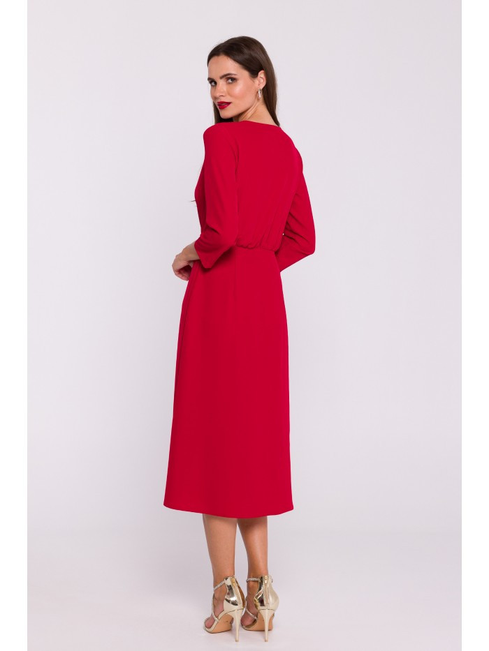 Tkané šaty se zavinovacím vrškem vysoký rozparek vpředu s ozdobnými knoflíky 7/8 rukávy délka pod kolena skrytý boční zip bez podšívky naše modelka je vysoká 174 cm a nosí velikost S navrženo a vyrobeno v Polsku Materiálové složení: 95% polyester 5% elastan VELIKOST S M L XL XXL A 36cm 37cm 38cm 39cm 40cm B 43cm 45,5cm 48cm 50,5cm 53cm C 35cm 37,5cm 40cm 42,5cm 45cm D 50cm 52,5cm 55cm 57,5cm 60cm E 47cm 47cm 47cm 47cm 47,5cm F 120cm 122cm 124cm 126cm 128cm G 40cm 40,5cm 41cm 41,5cm 42cm
