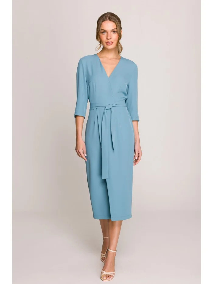 DETAILY PRODUKTU: tkaná látka pouzdrové midi šaty zavinovací design výstřih ve tvaru V částečně podšitý horní díl tříčtvrteční rukávy částečně elastický pas pásek na zavázání skrytý zip na zádech naše modelka měří 175 cm a nosí velikost S navrženo a vyrobeno v Polsku Materiálové složení: 95% polyester 5% elastan VELIKOST S M L XL XXL A 39 cm 40cm 41cm 42cm 43cm B 48cm 50,5cm 53cm 55,5cm 58cm C 34cm 36cm 38cm 40cm 42cm D 48cm 50,5cm 53cm 55,5cm 58cm E 41cm 41,5cm 42cm 42,5cm 43cm F 118cm 119cm 120cm 121cm 122cm