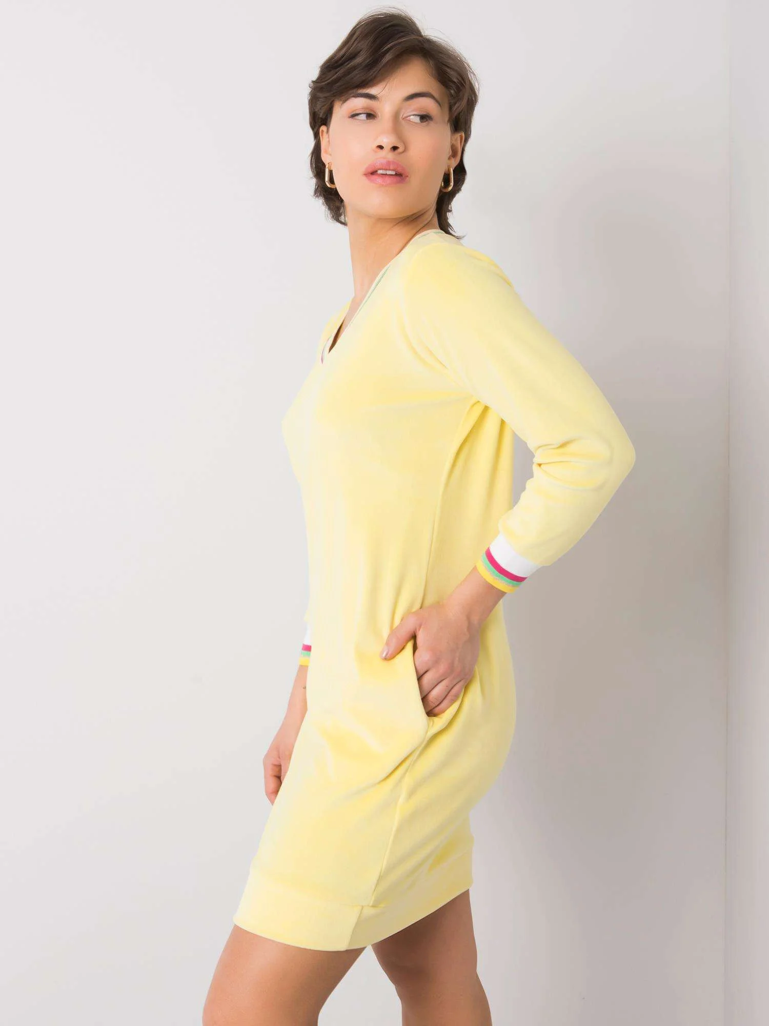 RUE PARIS Žluté velurové šaty. Příslušenství: kapsy složení látky: 95% bavlna, 5% elastan způsob praní: praní v pračce na 40 °C Modelka má na sobě velikost S. Rozměry modelky: výška 160 cm, poprsí 87 cm, pas 59 cm, boky 89 cm. Rozměry šatů velikosti S měřené na plocho: šířka v podpaží - 48 cm, celková délka - 79 cm, délka rukávu - 47 cmMezinárodní velikostVýškaObvod hrudníkuObvod pasuS36160-1688272-80M38162-1728678-86L40164-1749184-90XL42166-1789688-96