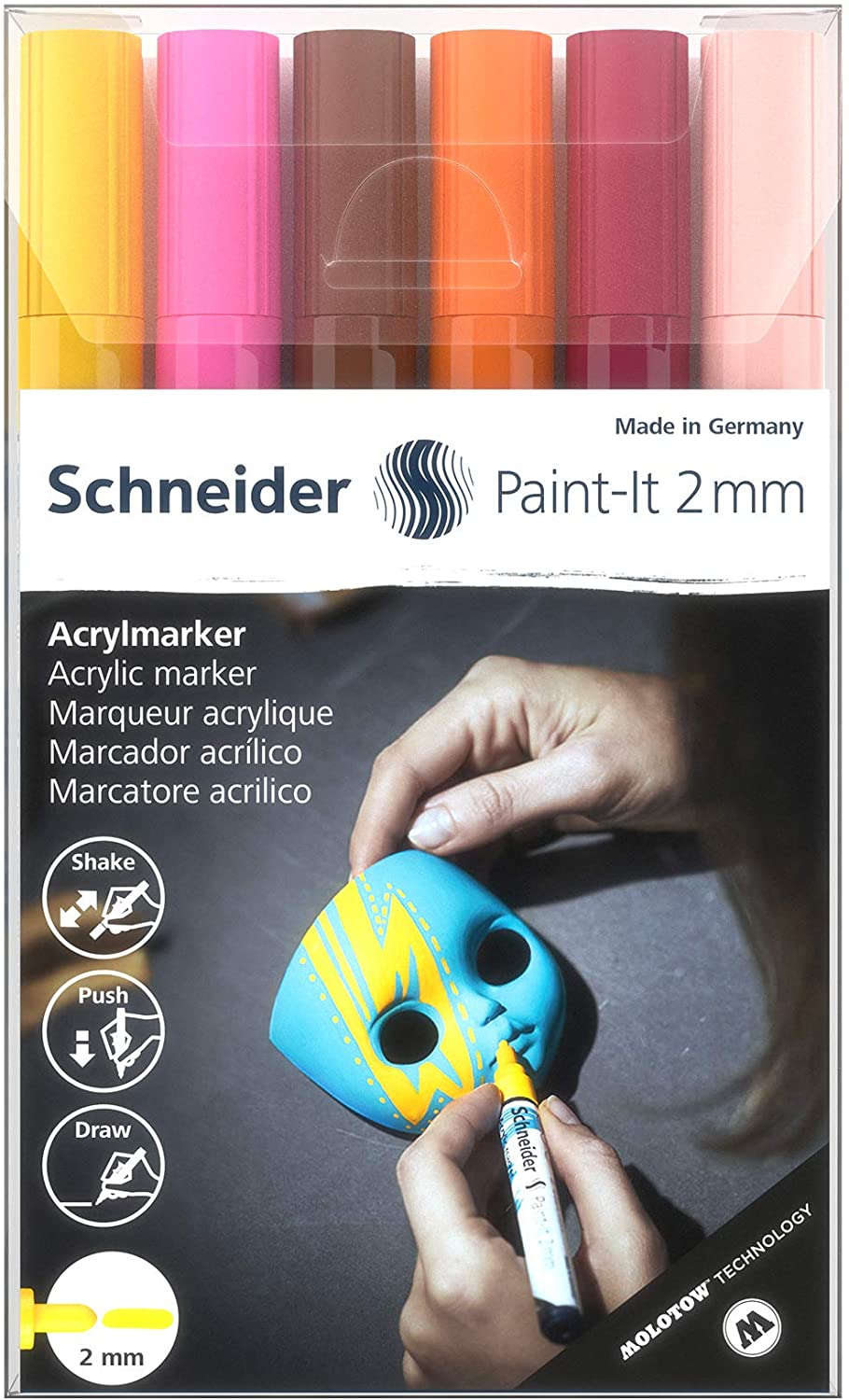 Sada obsahuje kvalitní akrylové popisovače s vysokou krycí schopností. Popisovače byly vyvinuty ve spolupráci s americkou firmou Molotow. Inkoust je netoxický, na vodní bázi. Šířka hrotu je 2 mm. Popisovač je vhodný pro velké množství povrchů od papíru, přes keramiku, textil, sklo, kov, plasty, kámen... V sadě je 6 ks popisovačů v plastovém pouzdře v tělových odstínech. Před použitím je třeba fixu protřepat. Pohybem dojde k aktivaci pigmentu a poté je nutné stlačit hrot o vodorovnou plochu, díky čemuž se do něj nasaje barva, poté je možné malovat běžným způsobem.