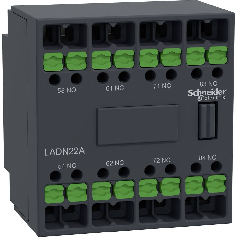 Pomocný kontaktní blok LADN Okamžitý pomocný spínací blok pro stykače LC1D a řídicí relé CAD. Nabízí 2 NO+2 NC kontakty se jmenovitým napětím až 10 a, 690 v AC, připojení přes svorku. Jednoduchá montá