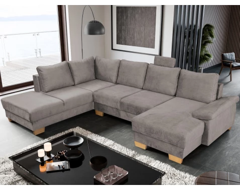Prostorná sedací souprava ve tvaru levé U, s velkými polštáři, rozkladem, úložným prostorem a opěrkou hlavy. Potažena látkou v barvě kamenná hnědo-šedá.