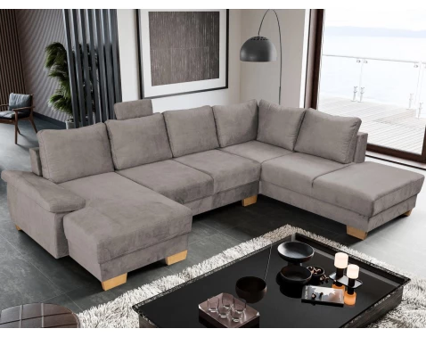 Prostorná sedací souprava ve tvaru pravé U, s velkými polštáři, rozkladem, úložným prostorem a opěrkou hlavy. Potažena látkou v barvě kamenná hnědo-šedá.