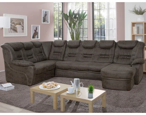 Velmi oblíbená sedací souprava s půdorysem do U vyniká svou prostorností a komfortně vysokým opěrákem. Očalouněna látkou v optice strukturované kůže v odstínu čokoládově hnědá. Prostorná sedačka s výrazným proševem a otomanem na pravé straně poskytne pohodlí pro celou rodinu. Sedačka je navíc vybavena relaxační funkcí sklápěcího opěráku, úložnou zásuvkou a rozkládací funkcí pro příležitostné spaní.