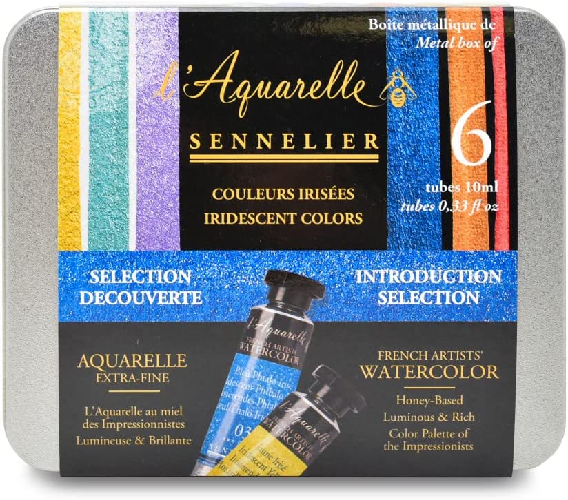 Pokud hledáte akvarelové barvy nejvyšší kvality, je značka Sennelier tou pravou volbou. Akvarelové barvy se vyrábí ručně, podle osvědčené receptury a výrobního postupu staršího více než 100 let. Základem hmoty je med, který má několik funkcí - v první řadě působí jako konzervant pro vysokou dlouhověkost. Dále pak zajišťuje hebkost, sametový vzhled a vysokou jasnost barev. Další komponentou je arabská guma, díky které mají barvy jemnou strukturu a působí velmi živě. Hlavní součástí jsou samozřejmě barevné pigmenty nejvyšší kvality. Součástí balení je 6 tubiček o objemu 10 ml (054, 060, 061, 091, 038, 080). Sada je uložená v praktické kovové kazetě. Balení je vhodné i na cesty. Iridescentní odstíny rozzáří a vyšperkují každé dílo k dokonalosti. Vysoká kvalita s dlouhou životností a naprostou lehkostí při práci (kdy stačí nanést malé množství pigmentu a výsledkem je zářivá dokonalost barev) předurčuje tuto sadu pro práci opravdových mistrů. Vyrobeno ve Francii.