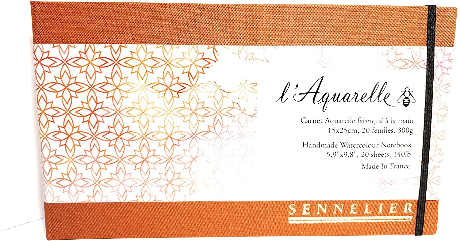 Akvarelový blok o velikosti 25 x 15 cm, má velmi kvalitní, ručně vyráběný papír, který je bez obsahu kyselin a bez použití optických rozjasňovačů. Díky tradičnímu výrobnímu postupu, má papír harmonickou texturu, s rovnoměrně tvarovanými vlákny, což zajišťuje jeho stabilitu a tím zajišťuje vynikající absorpci vody. Papír je o mimořádné gramáži 300 g/m2 takže snese velké množství vody při malování. Blok je opatřený kroužkovou vazbou, která umožňuje malování až ke kraji, obsahuje 20 listů. Součástí desek je také praktická gumička, která zabraňuje otevírání vazby. Jedná se o zápisník prémiové kvality, určený pro profesionální výtvarníky. Je mimořádně vhodný na cesty a malování v plenéru. Vybírat můžete ze 3 velikostí zápisníků. Vyrobeno ve Francii.