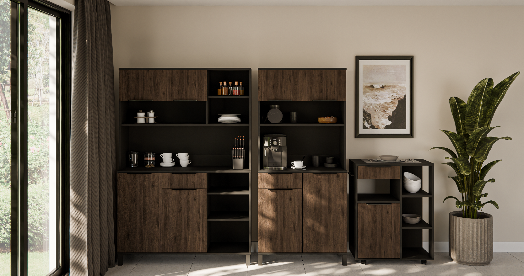 Sestava Monza Vlastnosti: Materiál Laminovaná dřevotřísková deska o síle 16 mm Zakončené hrany ABS hrana o síle 1 mm Úchyt Matný kovový černý úchyt Vnitřní barva Vnitřek skříně je v černé barvě Pracovní deska Pracovní deska v černé barvě součástí balení • Barevná kombinace Komponenty ze sestavy Monza jsou dodávány v kombinaci černého korpusu a odstínu Ořech okapi. Černá matná korpus Ořech okapi dvířka • Komponenty sestavy Monza Sestava Monza se skládá ze tří komponentů, které lze zakoupit i samostatně. Buffet Monza 120Buffet Monza 80Roller Monza Buffet Monza 120 Buffet Monza 80 Roller Monza 70 • Sestava MonzaModerní kuchyňská sestava Monza je ideálním řešením do kanceláří či menších prostor. Zobrazit produkty... •