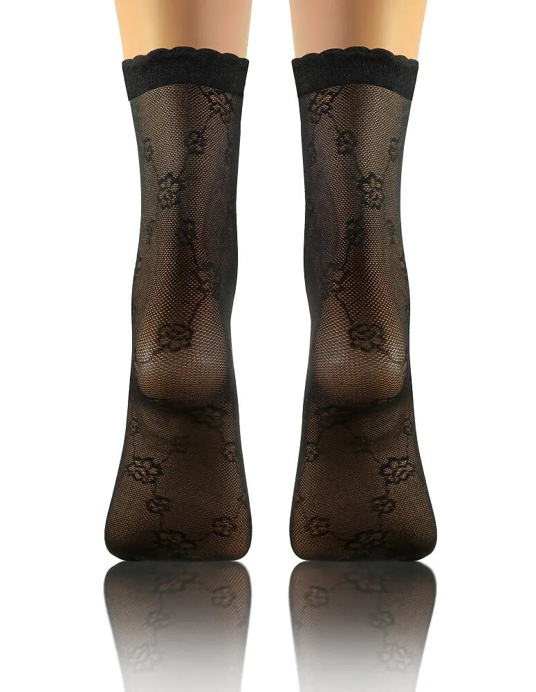 Tenké dámské ponožky - zdobené jemným vzorem - netlačící lem s volánkem - balené po dvou párech v plastovém sáčku Složení: 91 % polyamid, 9 % elasta