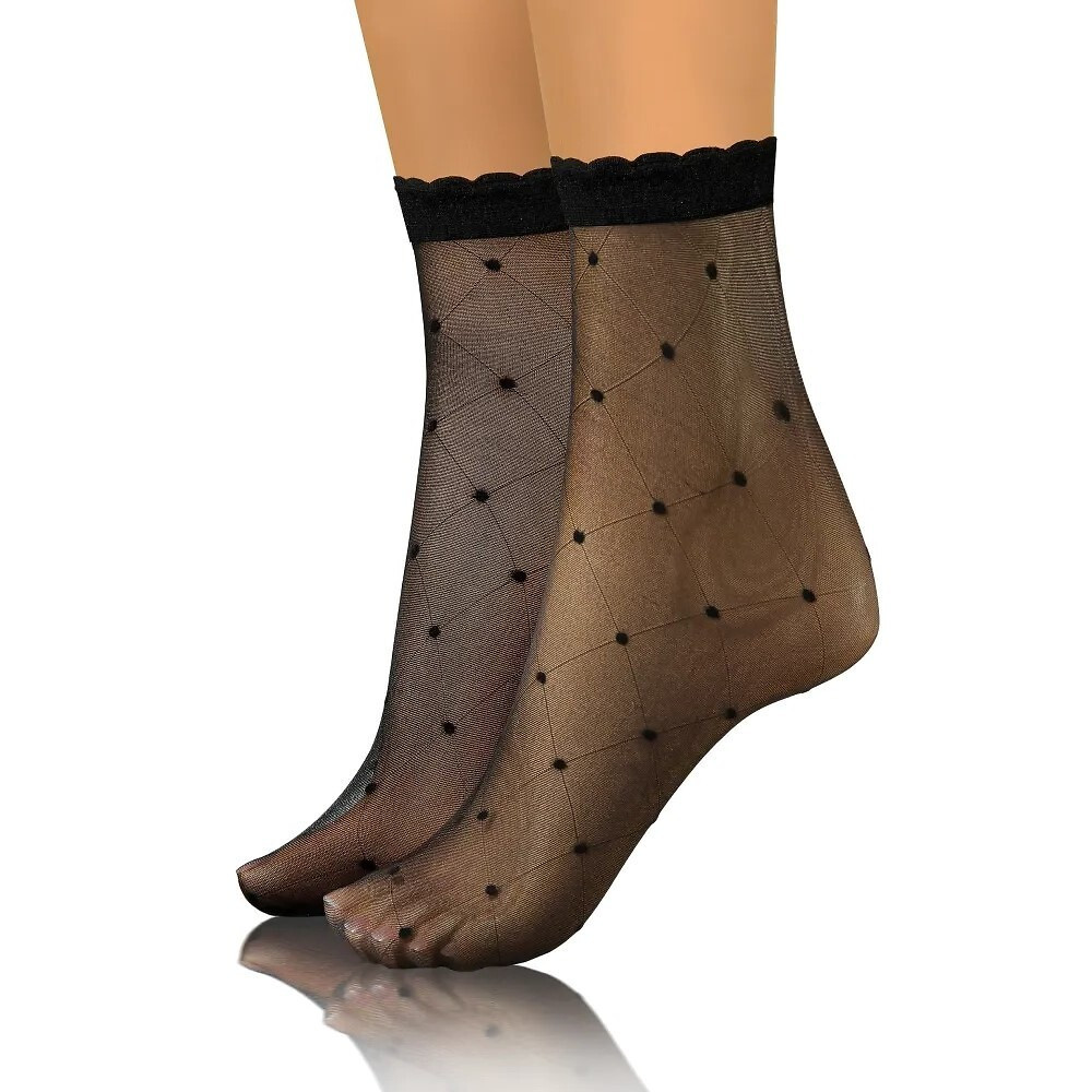 Tenké dámské ponožky - zdobené jemným vzorem - netlačící lem zakončený volánkem - baleno po dvou párech v plastovém sáčku Složení: 91 % polyamid, 9 % elasta
