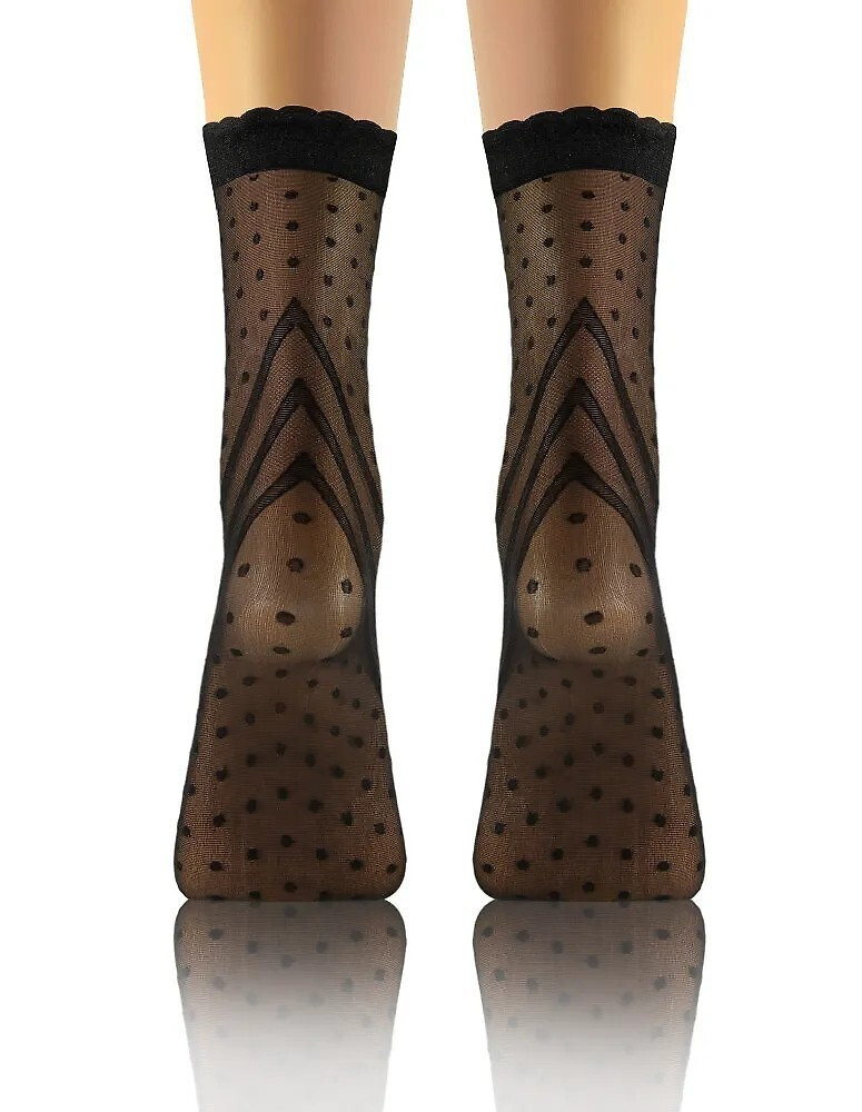 Tenké dámské ponožky - síťovina - zdobené poutavým vzorem - netlačící lem zakončený volánkem - baleno po dvou párech v plastovém sáčku Složení: 91 % polyamid, 9 % elastan