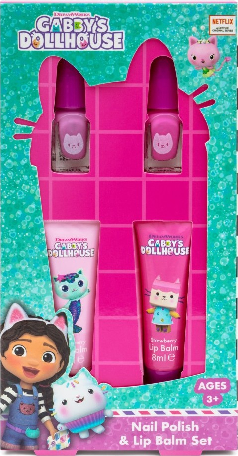 Dárkový set Gabby´s Dollhouse obsahuje 2× 2,5ml lak na nehty a 2× 8ml balzám na rty. Aplikujte na rty podle potřeby. Pokud se objeví podráždění, přestaňte používat. Při prvním použití otestujte na malé ploše pokožky, zda se neprojeví alergická reakce. Neaplikujte na poškozenou, zanícenou nebo citlivou pokožku. Jen k zevnímu použití.