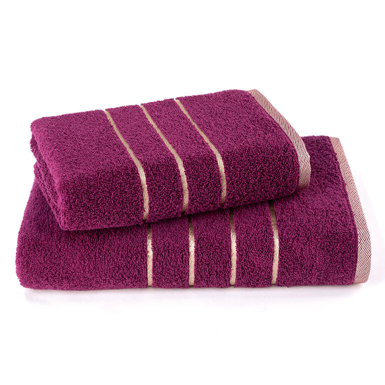 Sada froté ručníku a osušky se zlatou bordurou v tmavě fialové barvě vnese do vaší koupelny nádech luxusu a elegance.
