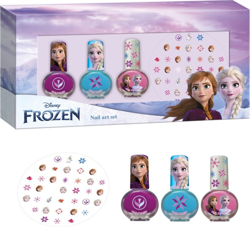 Dárková sada pro děti obsahuje Disney Frozen 3 x lak na nehty, nálepky na nehty. Lak na nehty aplikujte přímo na nehty. Lak jednoduše odstraníte vodou.