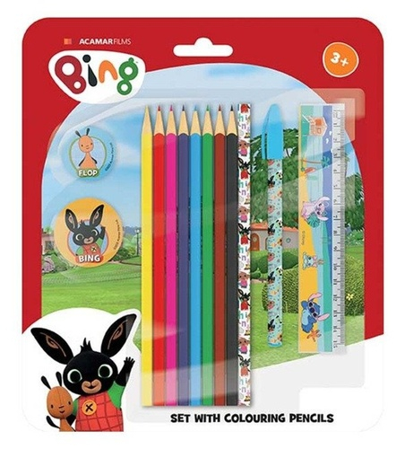 Set obsahuje tužku, propisku, ořezávátko, gumu, pravítko a 8 barevných pastelek.