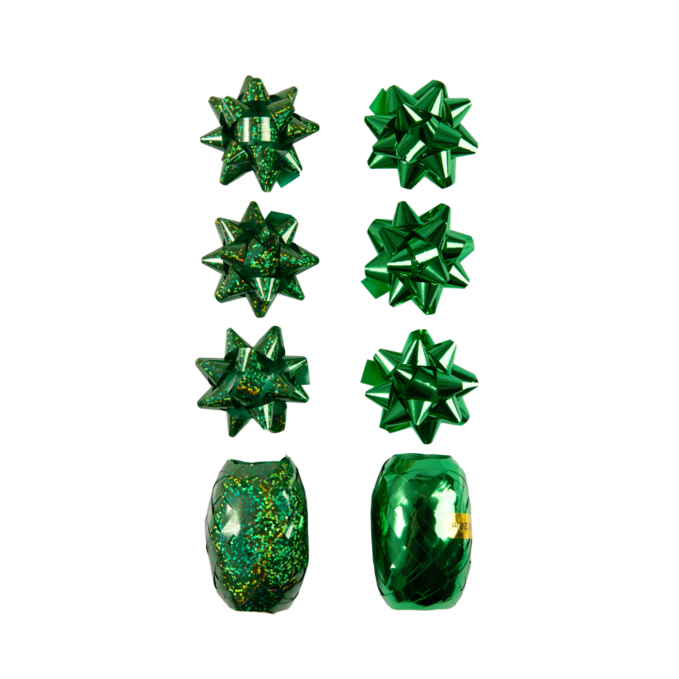 Mix metalických a holografických zelených kokard a vázacích stuh v celkové délce 40 m. Balení obsahuje: 3 metalické kokardy, 3 holografické kokardy, 1 metalickou stuhu a 1 holografickou stuhu. Šířka stuhy: 5 mm Délka stuhy: 2 × 20 m Průměr kokardy: 5 cm