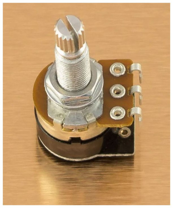 Potenciometr pro elektrické kytary s okamžitým stisknutím tlačítka, zdvih stisknutí přibližně 1 mm - pružinový, montážní pouzdro: 16 mm se závitem M7 x 0,75, odpor: 500 kOhm, s lineárním zúžením, určeno pro aktivní snímače
