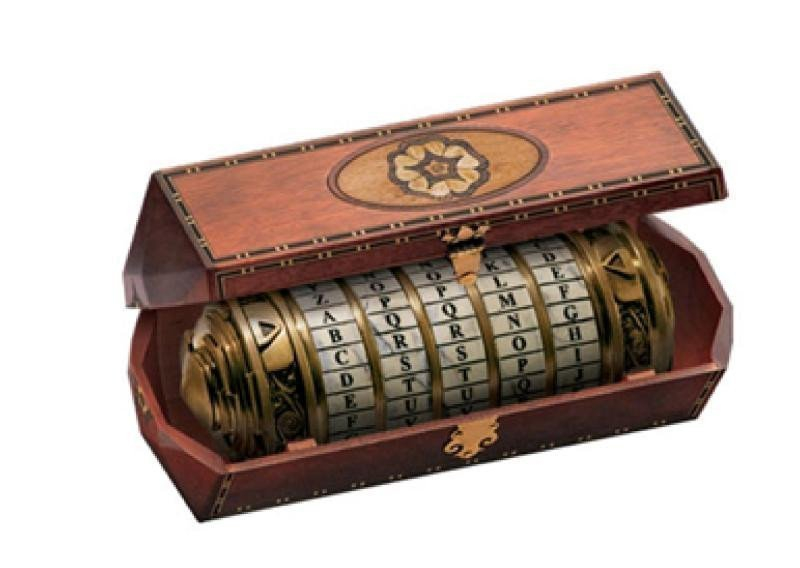 Funkční replika hlavolamu Kryptex v dřevěném pouzdře. Rozměry: 14 x 4,5 cm