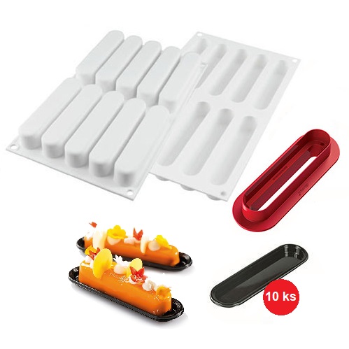 Sada na výrobu moderních dezertů v podlouhlém tvaru. Balení obsahuje 1 formu. Sada se skládá s jedné silikonové formy o 10ti pozicích, oboustranného vykrajovátka a 10 ks jednorázových černých tácků. Rozměr 1 ks dezertu: 130 x 25 mm, výška 25 mm. Objem jednoho dezertu: 80 ml. Balení obsahuje 1 ks formy. Obrázek je pouze ilustrační. Silikonové formy od firmy Silikomart se vyznačují vysokou variabilitou použití. Jsou vhodné na pečení, na mražení, odolávají teplotám -60°C do +230°C. Pružnost a flexibilita forem umožňuje jejich jednoduché skladování, jsou nenáročné na prostor. Všechny formy od firmy Silikomart jsou vhodné do myčky na nádobí a jejich kvalita je garantována pro časté používání.