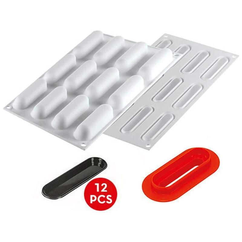 Sada na výrobu moderních dezertů v podlouhlém tvaru. Balení obsahuje 1 formu. Sada se skládá s jedné silikonové formy o 12-ti pozicích, oboustranného vykrajovátka a 12 ks jednorázových černých tácků. Rozměr 1 ks dezertu: 80 x 22 mm, výška 22 mm. Objem jednoho dezertu: 30 ml. Balení obsahuje 1 ks formy. Obrázek je pouze ilustrační. Silikonové formy od firmy Silikomart se vyznačují vysokou variabilitou použití. Jsou vhodné na pečení, na mražení, odolávají teplotám -60°C do +230°C. Pružnost a flexibilita forem umožňuje jejich jednoduché skladování, jsou nenáročné na prostor. Všechny formy od firmy Silikomart jsou vhodné do myčky na nádobí a jejich kvalita je garantována pro časté používání.
