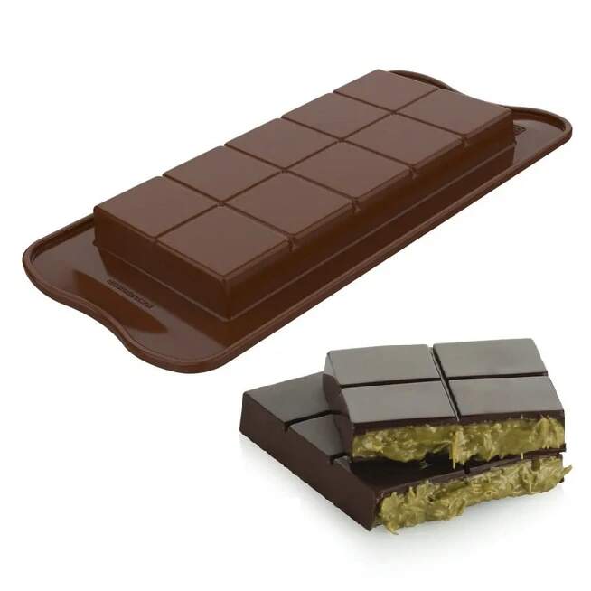 Silikonová forma vhodná na výrobu skvělé čokolády. Výhodou této formy je její výška, lze ji naplnit velkým objemem lahodné náplně. Formičky jsou jednoduché k použití, přizpůsobivé, dlouhodobé a netoxické. Lze je používat v pečící i mikrovlnné troubě, v lednici i mrazničce. Odolávají teplotám -60°C až 230°C. Rozměry formy: 155mm x 75mm x 15mm Celkový objem: 175 ml