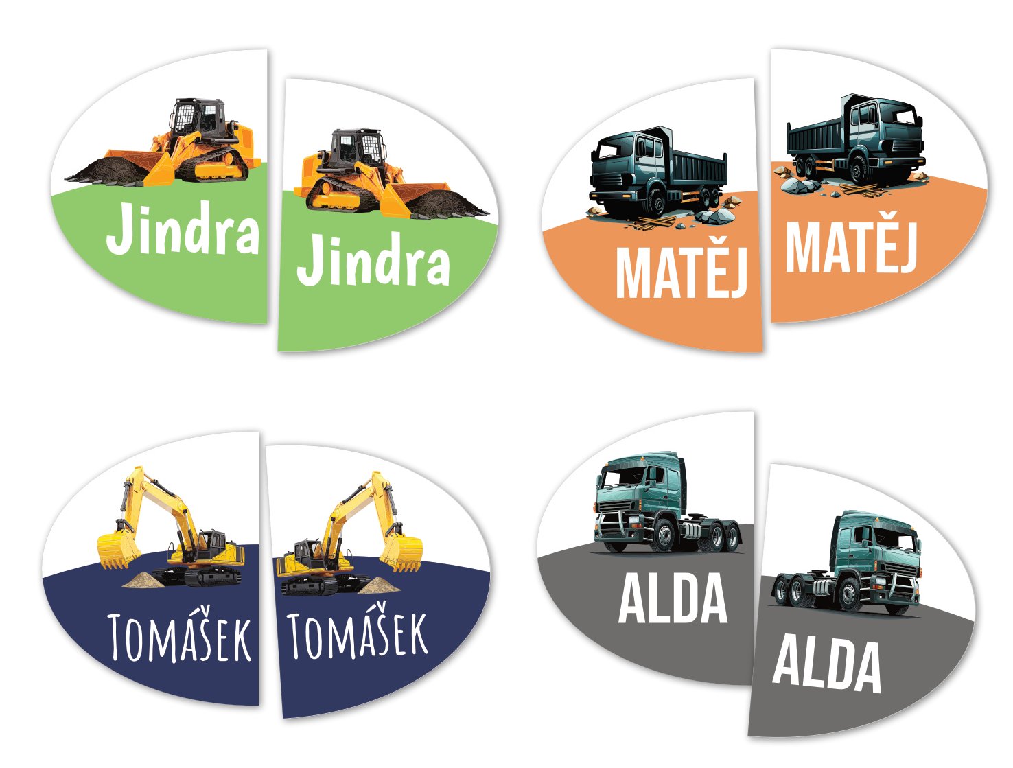 Samolepící jmenovky s obrázky velkých a silných strojů, které nadchnout každého kluka. V provedení na boty usnadní rozlišení pravé a levé nohy. Velikost 29x23mm, s 36 kusy samolepek označíte 18 párů obuvi! Se stejnými obrázky můžete pořídít i ladící samolepky na oblečení. V případě aplikace na obuvi doporučujeme umístění na štítek na jazyku, vnitřní či vnější stranu boty, případně stélku. V případě umístění na stélku, která je vyrobena z různých materiálů může dojít vzhledem k velkému namáhání, kontaktu s nečistotami, pískem atd, k opotřebení či posunu jmenovky. Samolepky nejsou pernamentní, slouží pro dočasné označení. Při správné aplikaci drží velmi dobře a dlouho. Motiv: bagr, traktor, nakladač, válec, demoliční, jeřáb, náklaďák, domíchávač, sklopka, kombajn, truck, pickup, vrtulník, loď, člun, vlak, lokomotiva, mašina, motorka, motocykl, hasiči, stříkačka, cisterna