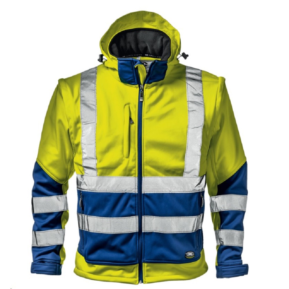 Bunda reflexní STARMAX 34567G softshellová žluto-modrá popis: softshellové reflexní bundy, vnitřní microfleecová úprava, reflexní pásky, odjímatelná kapuce na zip, stahovatelná plastovými stopery, oddělitelné rukávy na zip, manžety se stahovaním pomocí suchého zipu, 1 náprsní a 2 boční kapsy na zip materiál: 100% polyester (3-vrstvý softshell) praní a čištění: doporučená teplota je 40°C, nežehlit, nesušit v sušičce, nebělit, chemicky nečistit použití: reflexní oděvy jsou ochranným oděvem kategorie 2, splňují požadavky EN ISO 20471 třídy 2 - mají fluorescenční plochu min 0,5 m2 a reflexní plochu min 0,13 m2, - vhodné pro použití např. na železnicích, staveništích a parkovacích plochách. Barva : žluto-modrá Velikost: S-3XL