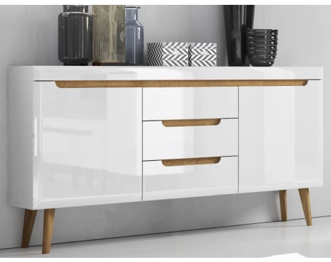 Široká komoda z kolekce Nordi - inspirujte se útulným severským stylem.Moderní nábytek v kombinaci dub/bílá lesk doplňují masivní dřevěné nožky.