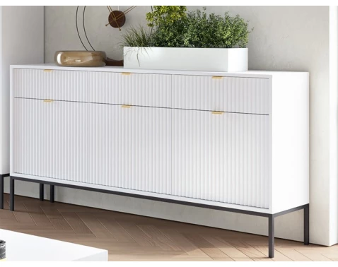 Široká komoda z kolekce Nova - atraktivní nábytek s bílými strukturovanými povrchy zaujme v každém moderně zařízeném interieru.
