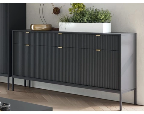 Široká komoda z kolekce Nova - atraktivní nábytek s černými strukturovanými povrchy zaujme v každém moderně zařízeném interieru. Stylový design