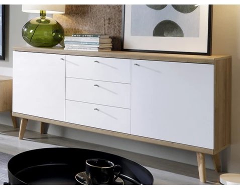 Široká komoda z programu Primo v příjemném skandinávském stylu. Kombinaci dubového dřevodekoru a bílé barvy doplňují zaoblené hrany a masivní nohy.