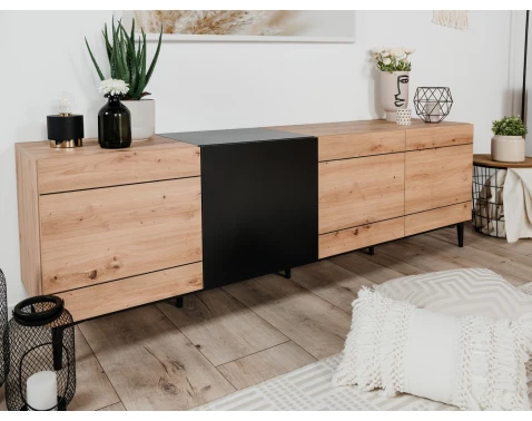Široká skříňka 4-dveřová z kolekce Nola - máte-li rádi moderní a zároveň zajímavý design, pak je tento nábytek právě pro vás. Útulný dubový dřevodekor doplňuje kontrast zajímavě vsazených černých ploch, černé horizontální linie a černá podnož. Masivně působící nábytek se zesílenými rámy tak díky nožkám vypadá odlehčeně a zároveň umožňuje snazší údržbu podlahy.