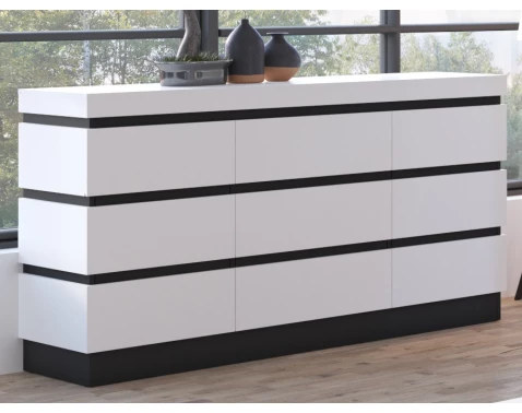 Široká úložná komoda o šířce 161 cm z programu Campania - moderní minimalistický styl s rovnými antracitovými liniemi kontrastuje s čistě bílými plochami. Můžete si tak zařídit moderní interier, který budete moct kdykoliv univerzálně kombinovat s dalšími barvami, což je velmi praktické.