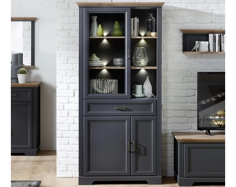 Široká vitrína s osvětlením v grafitové a dubové kombinaci z kolekce Jasmin přinese do vašeho interiéru útulnost a tradiční venkovský styl s moderním nádechem.