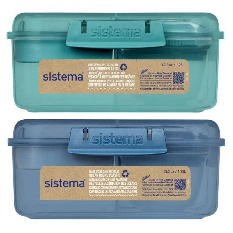 Recyklovaná Tříkomorová krabička Ocean Bound s nádobou na jogurt a 2 tácky 1,25 l je vyrobená z 35 % plastu sesbíraného z vodních toků, pláží a pobřeží, aby neskončil v oceánu. Krabička je ideální pro přenášení oběda, svačiny nebo salátu. Součástí krabičky je také nádoba na jogurt a dva tácky, pro jednodušší organizací vašeho jídla. Krabička má silikonové těsnění, které udržuje potraviny čerstvé. Výhody: Tři komory pro oddělení potravin Nádoba na jogurt Dva tácky pro organizaci jídla Silikonové těsnění Z 35 % recyklovaného plastu Ekologická