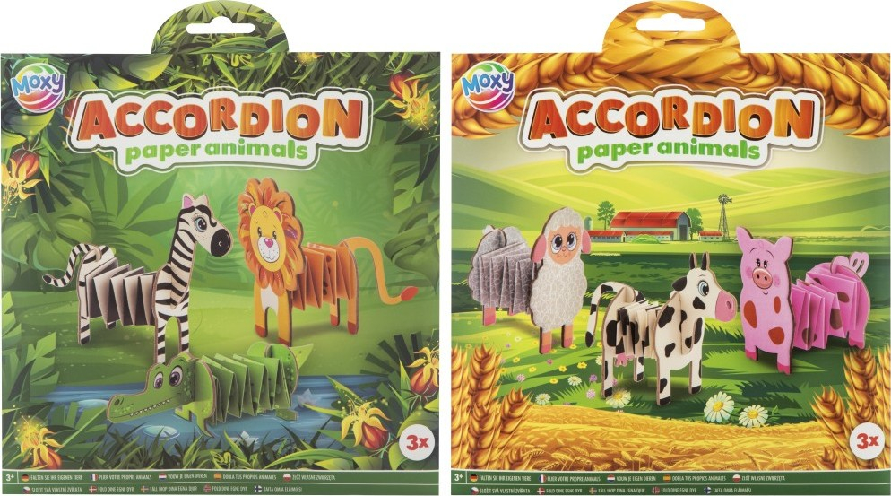 Skládací harmoniková papírová zvířátka domácí/džungle – sada na výrobu vtipných papírových harmonikových zvířátek. S touto sadou si můžete vyrobit 3 zvířátka z džungle (zebra, lev a krokodýl) nebo 3 hospodářská zvířátka (ovce, kráva a prase).